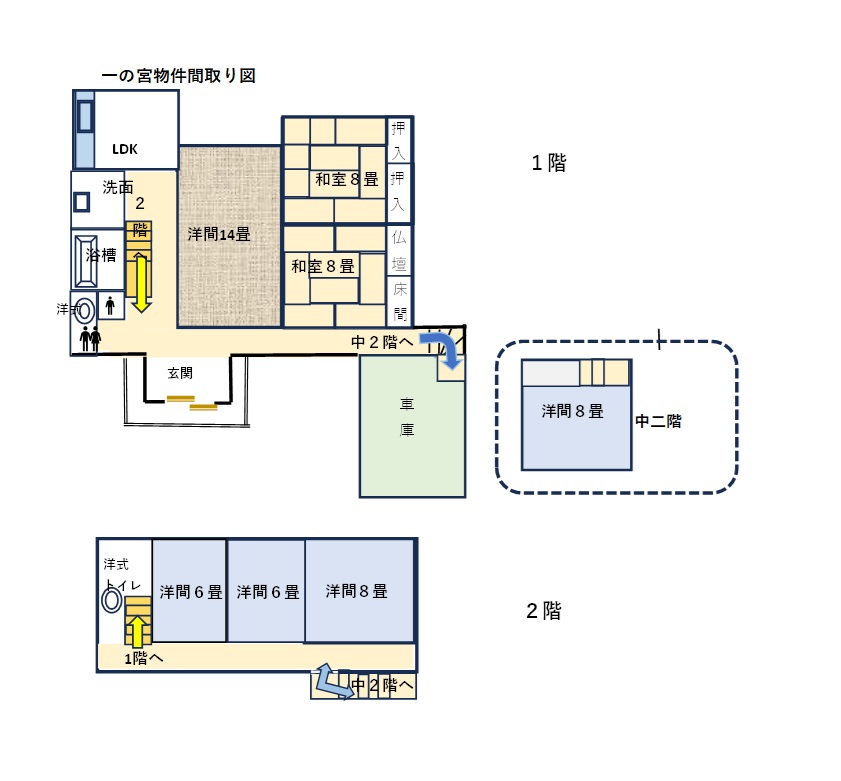 和室 8畳 1階 2室 洋室 14畳 1階 1室 洋室 8畳 1.5階 1室 洋室 6畳 2階 2室 LDK 6畳 1階 1室 洋室 8畳 2階 1室 |