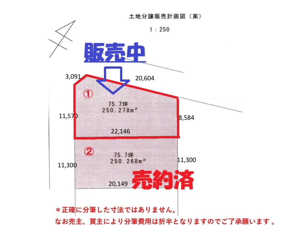 参考区画は①と②の区画となり、ほぼ同じ面積で開口部は11m以上です。早い者勝ちです。①は坪単価8万円、も坪単価8万円が目安です。