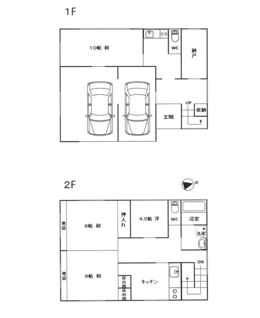 K 1階 1室 和室 10畳 1階 1室 和室 8畳 2階 2室 洋室 4.5畳 2階 1室 DK 5畳 2階 1室 1F:居間10畳キッチン,納戸 2F:DK、和室2、洋間1 |